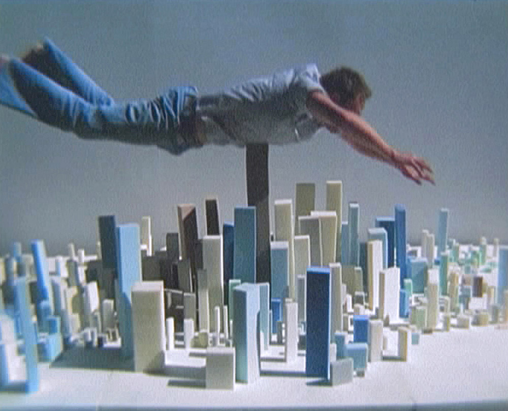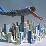 Человек прыгает с неба, но остается цел и невредим. Городские строения из пены смягчают его падение.